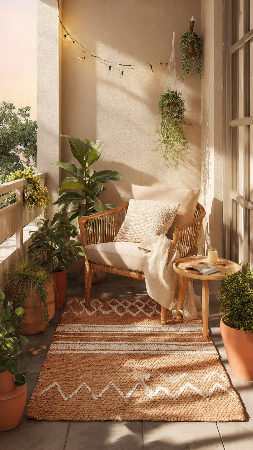 Layering rugs adds dimension and warmth to your balcony. Start with a natural jute rug as the base, then place a patterned rug on top to create visual depth. Neutral and earthy tones keep the look cohesive.