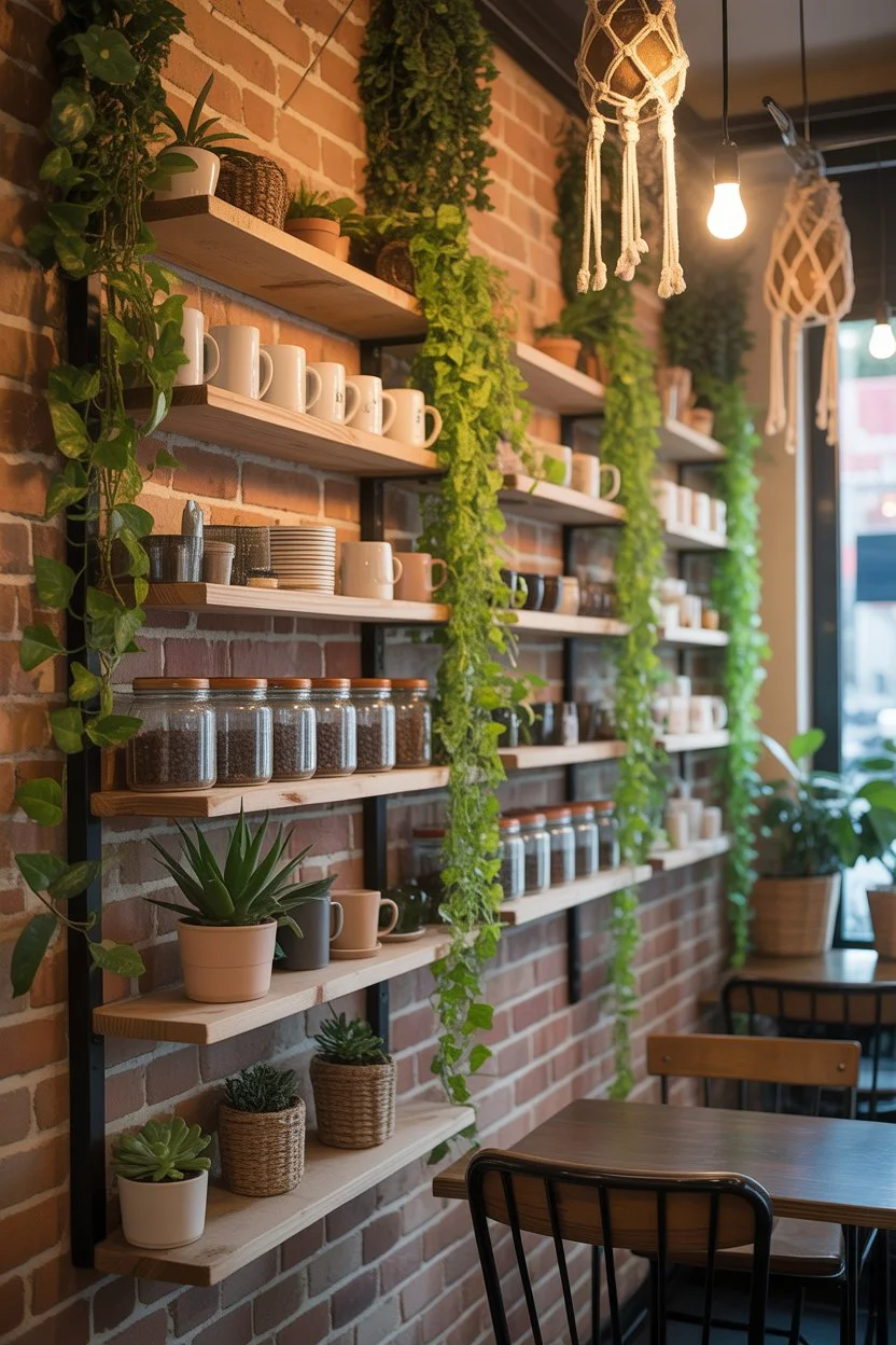 Tip: Vertical plant walls or shelves with trailing vines can serve as both a visual focal point and sa pace-saving solution. Plants also photograph beautifully, making your cafe Pinterest-ready.