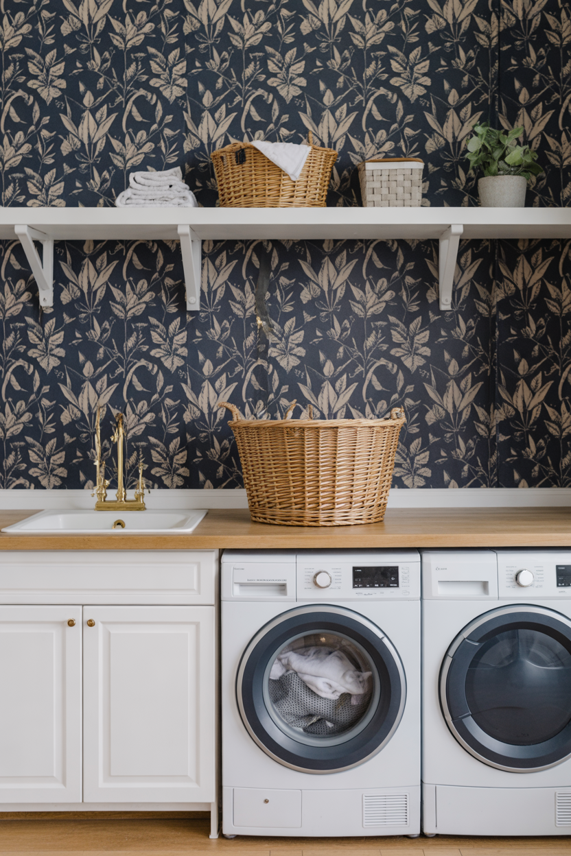 Not a painter? No problem. Dark blue wallpaper is having a serious moment right now, and it’s perfect for laundry rooms because you’re usually working with a small area, which means one roll can go a long way.