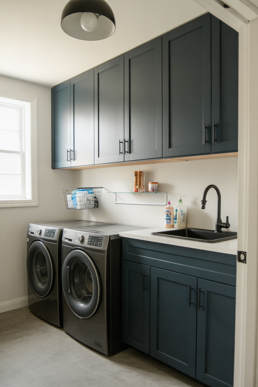 If your washer and dryer are tucked into an alcove, paint that alcove in a deep navy blue and leave the rest of the room lighter. The contrast frames your appliances beautifully — suddenly they look like they were meant to be there, built-in and intentional.