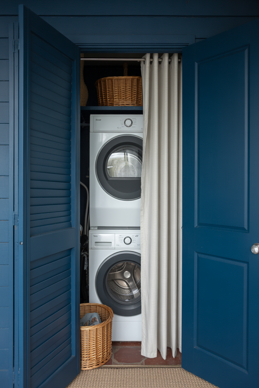 Got a closet-sized laundry space? Perfect. Paint the whole thing — walls, ceiling, even the back panel — in one deep navy shade. Add a curtain or sleek bi-fold doors to hide it when not in use.