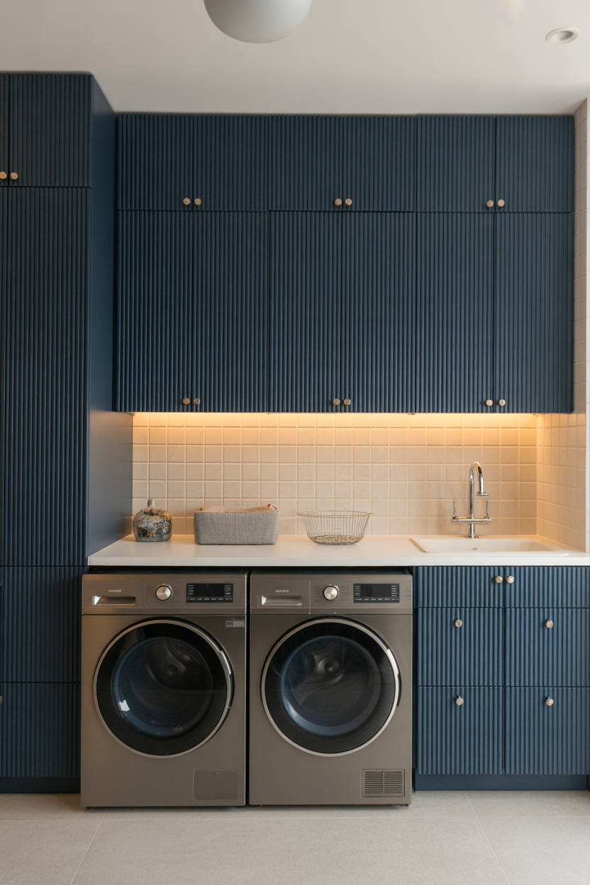 This is the full commitment look — and it pays off completely. Shaker-style cabinets in a deep navy give your laundry room a custom, high-end feel that honestly rivals any kitchen renovation. Add a white quartz countertop on top, and you’ve created a space that people will ask about every single time they visit.