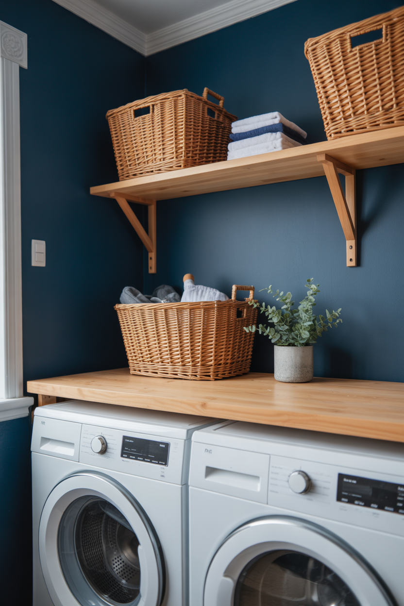 Want your dark blue laundry room to feel cozy and Scandinavian rather than bold and dramatic? Bring in warm wood tones. A floating wood shelf above the washer and dryer, a butcher block countertop, or even just wood-handled baskets — all of it softens the navy beautifully.