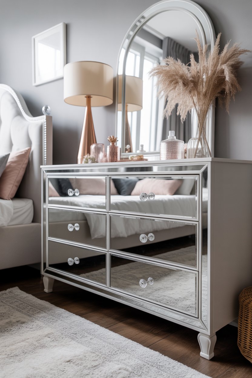 If you want your room to feel brighter, mirrors can help a lot. Adding mirror panels to your dresser reflects light and makes the space look bigger.