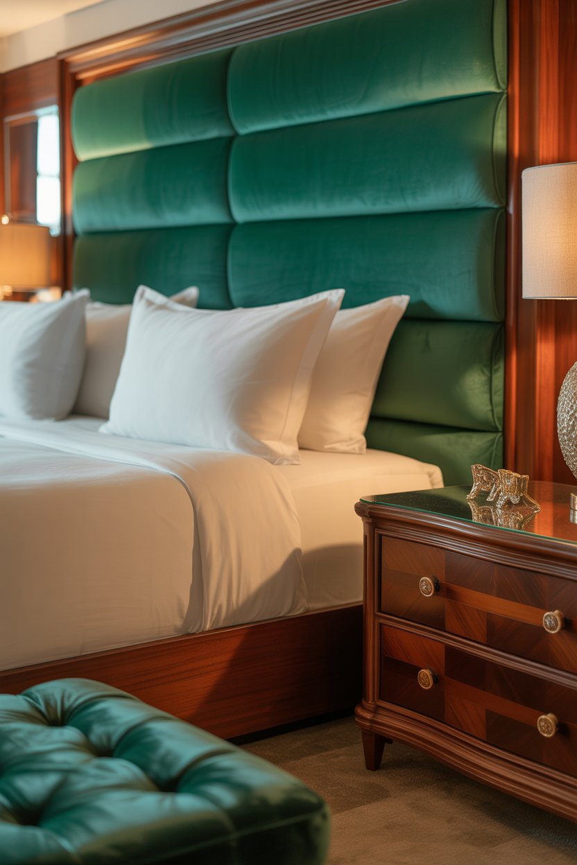 - Velvet headboards in emerald or deep green amplify the luxury feel.