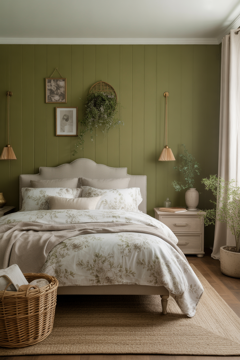 Olive green walls paired with soft floral textiles bring a cozy cottage feel to the guest bedroom. The earthy green tones evoke a garden-like serenity, while warm wooden furniture adds grounding and character. Layered textures, like knitted throws, linen bedding, and woven rugs, create a welcoming atmosphere that feels both lived-in and elegant. Perfect for a romantic, relaxed vibe, this design blends comfort with timeless charm.