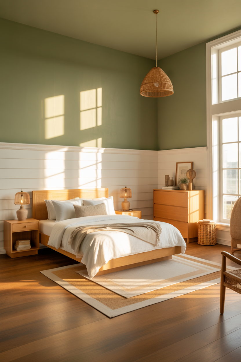 Sage green walls paired with crisp white shiplap create a timeless, airy retreat that feels effortlessly calming. The soft green acts as a neutral backdrop, while the shiplap adds subtle texture and coastal charm. Plush linens, layered rugs, and warm wooden accents make the room inviting, while plenty of natural light enhances the serenity. This style is perfect for anyone seeking a relaxed, modern aesthetic without sacrificing luxury.