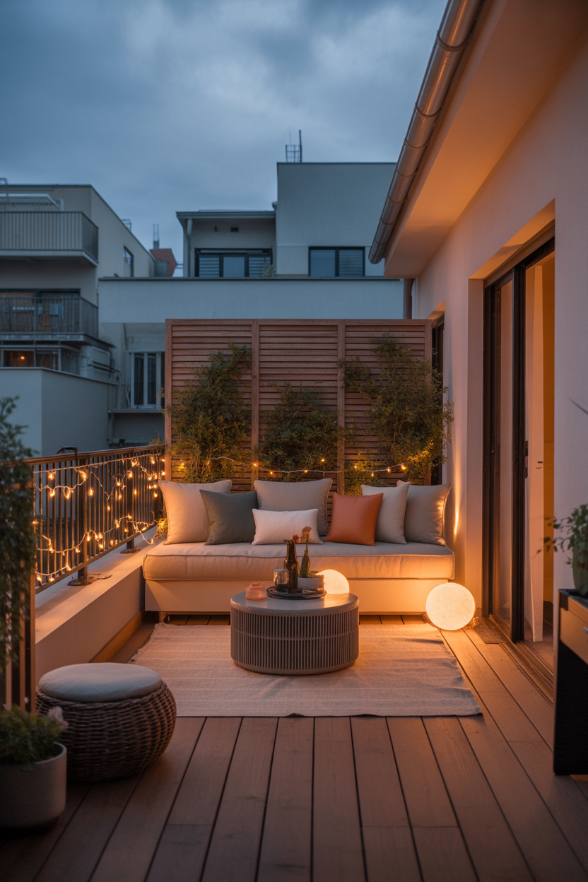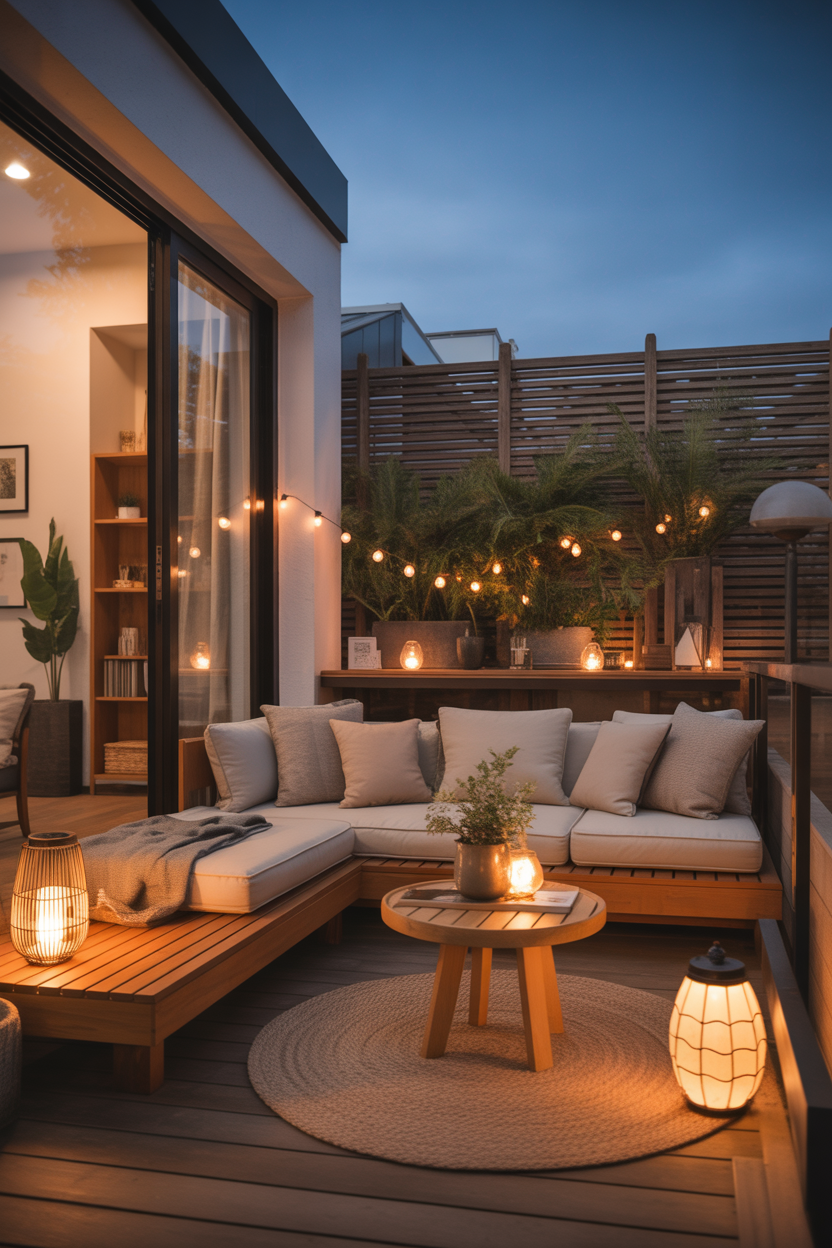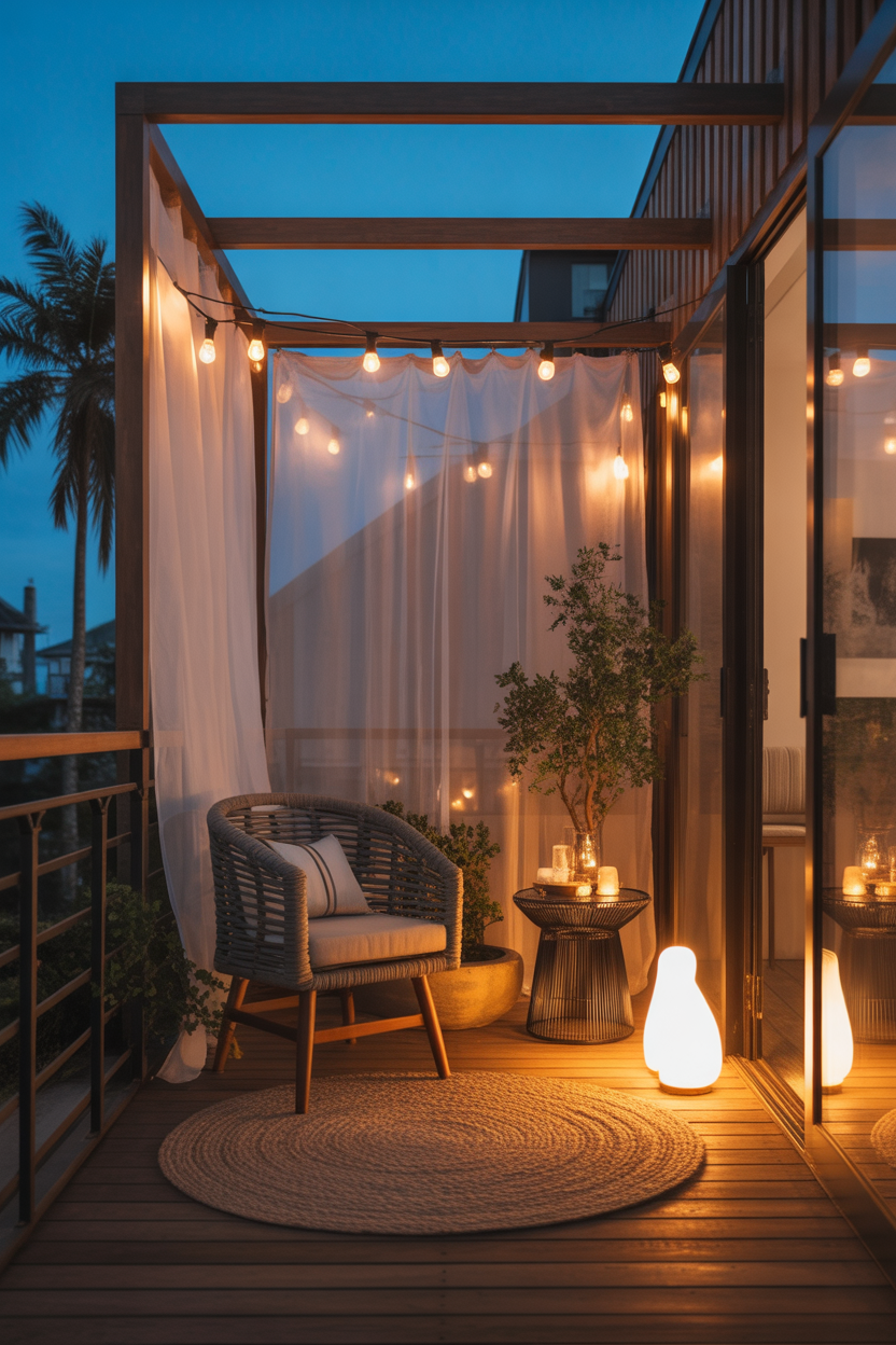 Lighting is what turns a simple balcony into a magical retreat. Warm string lights create a soft glow that instantly makes the space feel cozy and inviting. In the Japandi style, lighting should feel natural and calming rather than harsh. Draping lights along railings or overhead adds depth and charm. As night falls, the balcony transforms into a peaceful escape perfect for unwinding. It’s one of the easiest ways to create a Pinterest-worthy look.