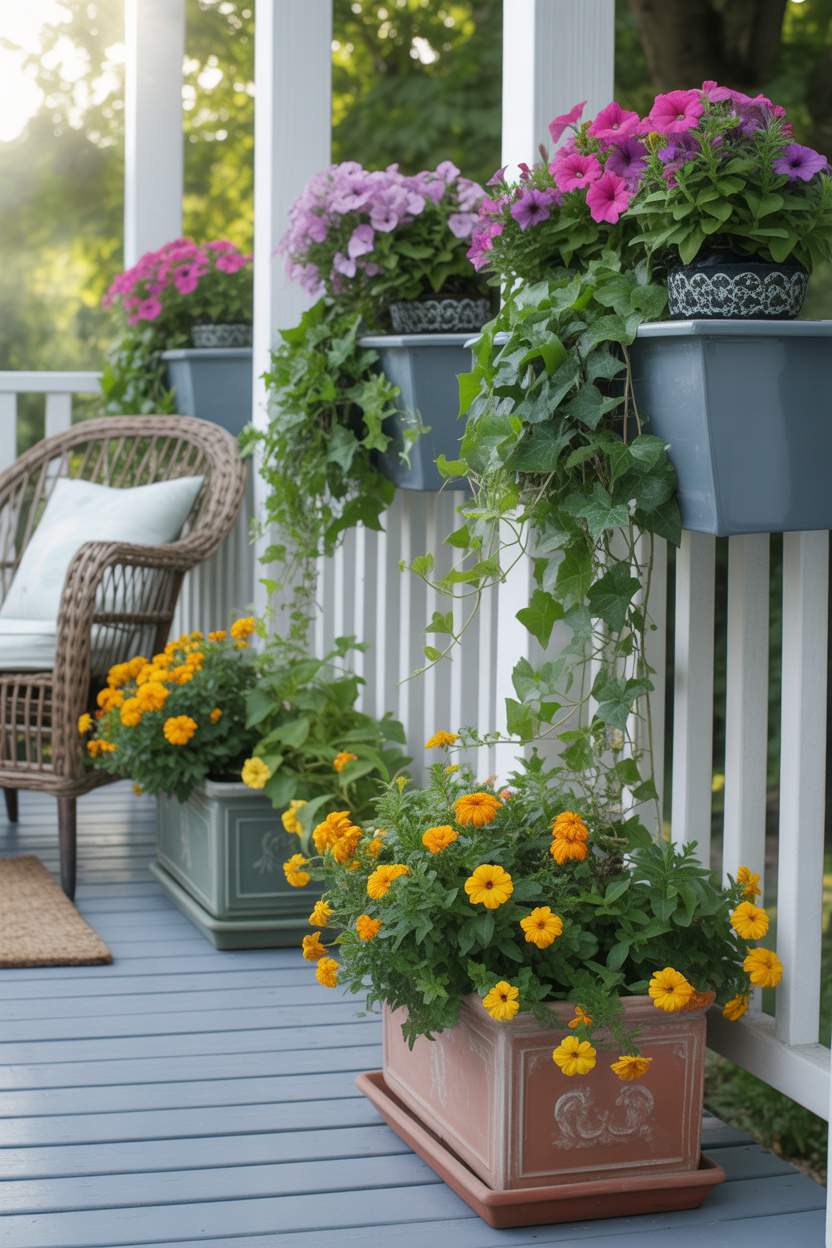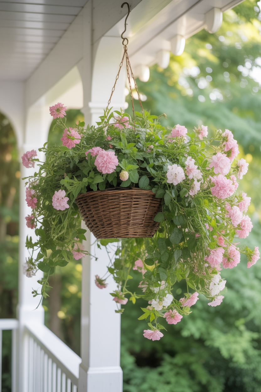 Hanging baskets bring a soft, floating effect to your porch. They add height and make the space feel more dynamic. Flowers like trailing petunias or ivy create a beautiful cascading look.
