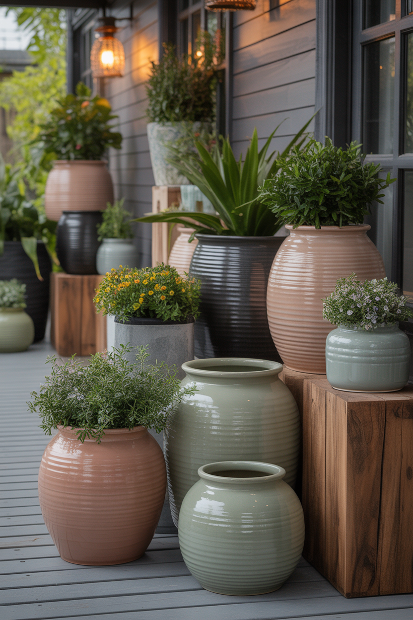 Mixing different textures can make your porch look rich and layered. Combining ceramic, wood, metal, and clay pots adds depth and visual interest. It keeps your setup from looking flat or boring.