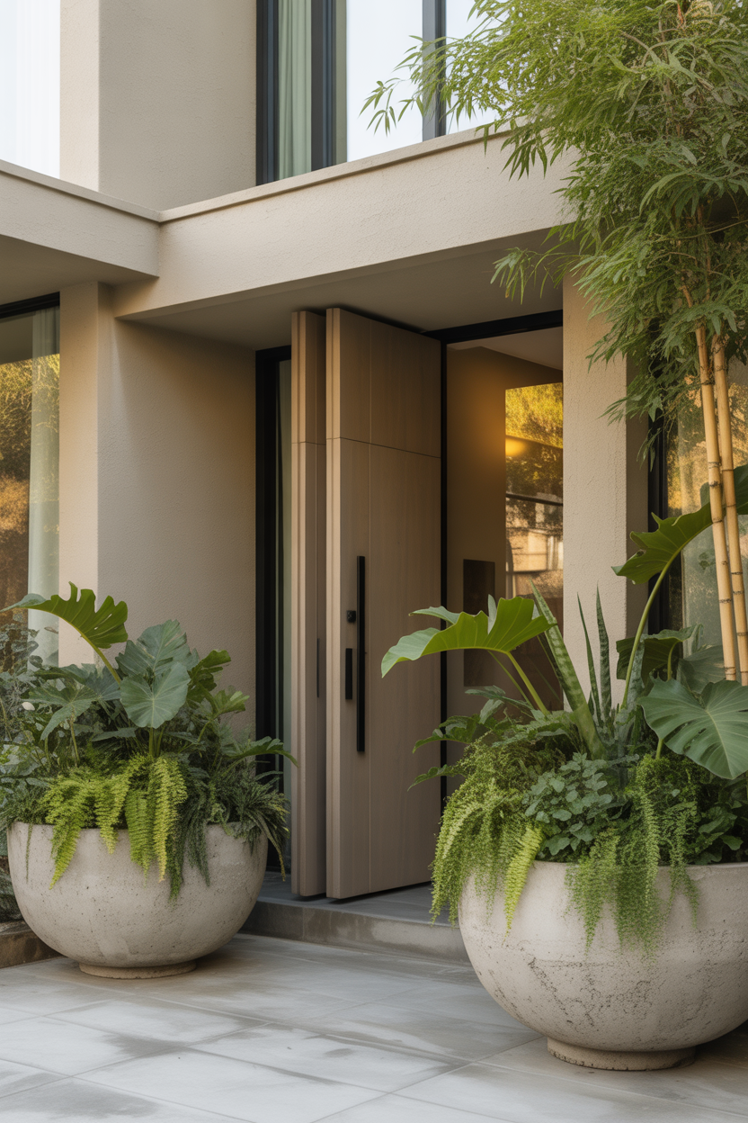 Choose plants that grow full and tall to match the pots’ scale. This creates a balanced look and avoids the pots feeling empty. It’s a simple way to make your entry look high-end and polished.