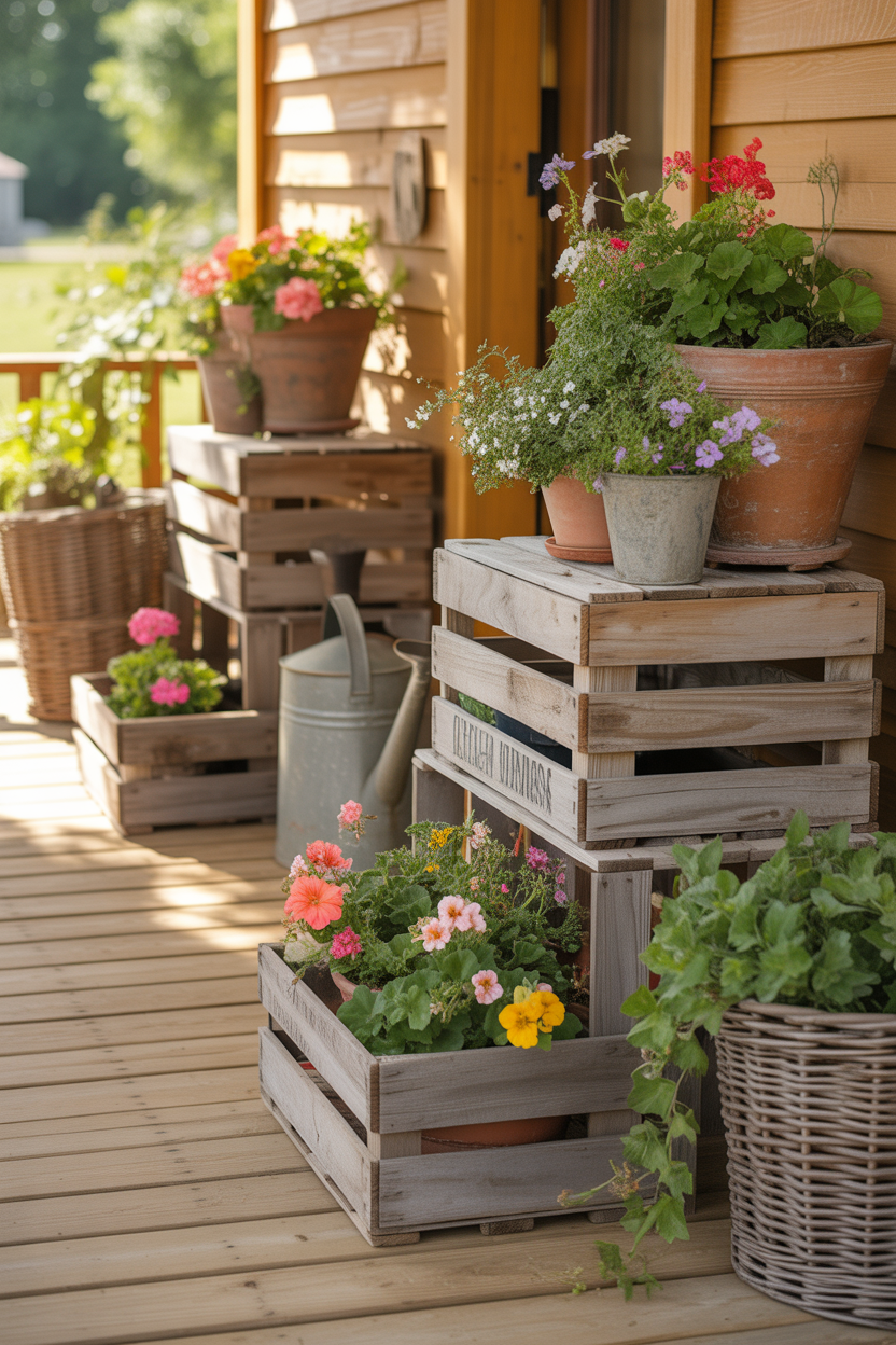 Rustic wooden crates bring warmth and character to your summer front porch flower pot ideas. When stacked or arranged creatively, they create a charming farmhouse-style display that feels both cozy and timeless. You can place flower pots inside the crates or on top for added height and structure.