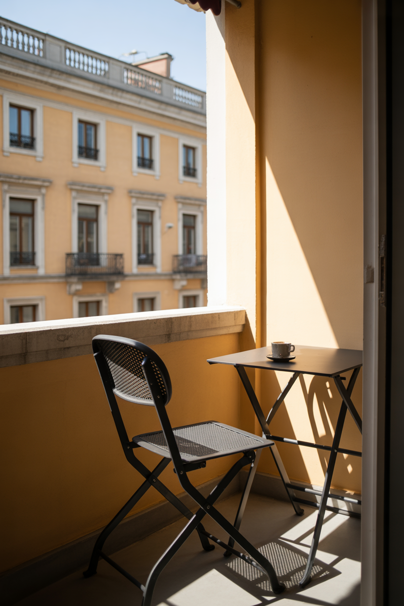 A Parisian bistro setup is one of the easiest ways to give your balcony a true European feel. A small round table with two simple chairs can instantly turn your space into a cozy café corner. It creates the perfect spot where you can sit, relax, and enjoy your morning coffee or evening tea.