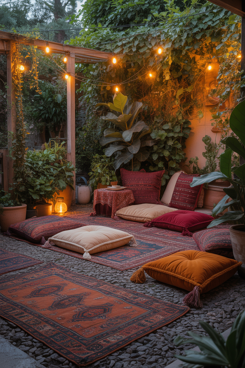 5. Boho-Style Gravel Patio with Rugs & Floor Cushions