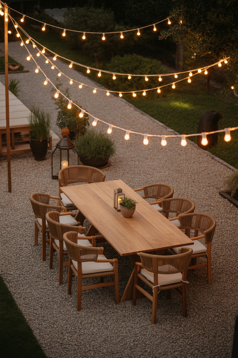 String lights instantly make any gravel patio feel magical. When hung overhead like a canopy, they create a soft, glowing ceiling. This setup is perfect for evening relaxation or small gatherings. The warm lighting adds depth and charm. Pair it with simple seating to keep the focus on the lights. It’s one of the easiest ways to upgrade your space.