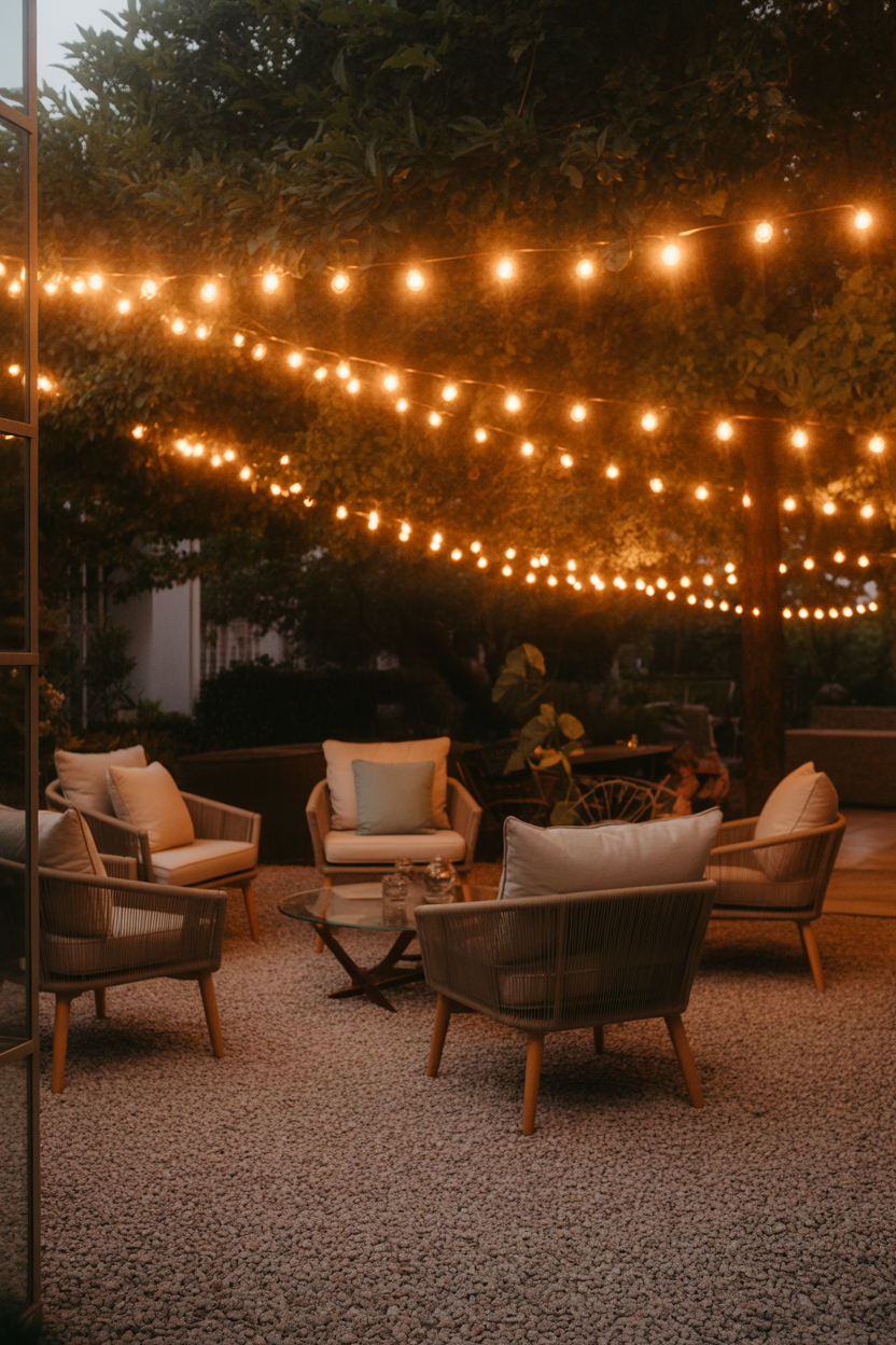 6. Gravel Patio with String Lights Canopy