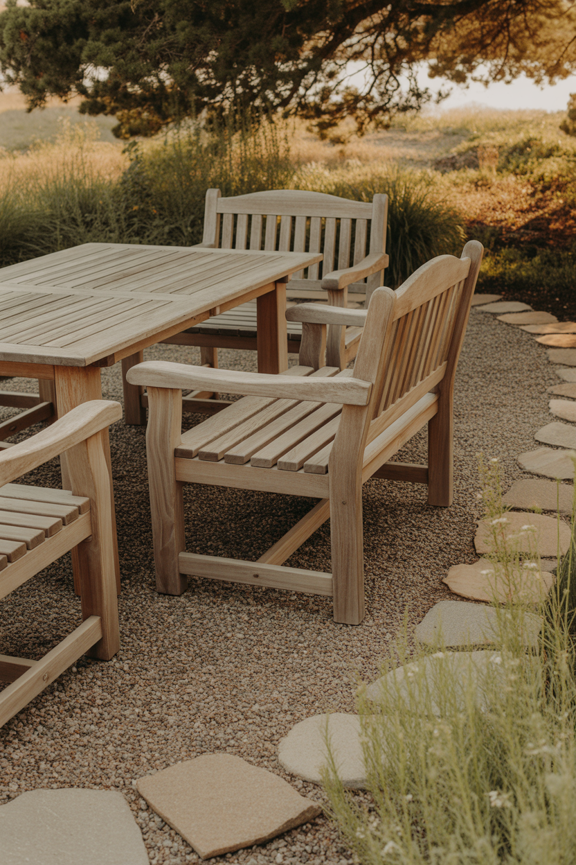7. Rustic Wooden Furniture Gravel Patio