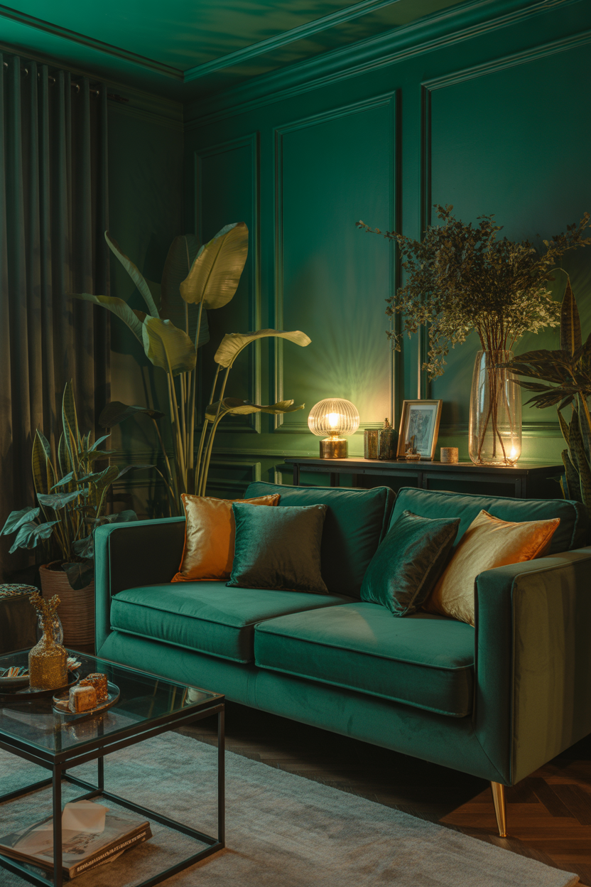 Emerald green brings life, richness, and royal energy into your living room. It creates a bold yet calming environment that feels luxurious and natural. This color works best with soft golden lighting.