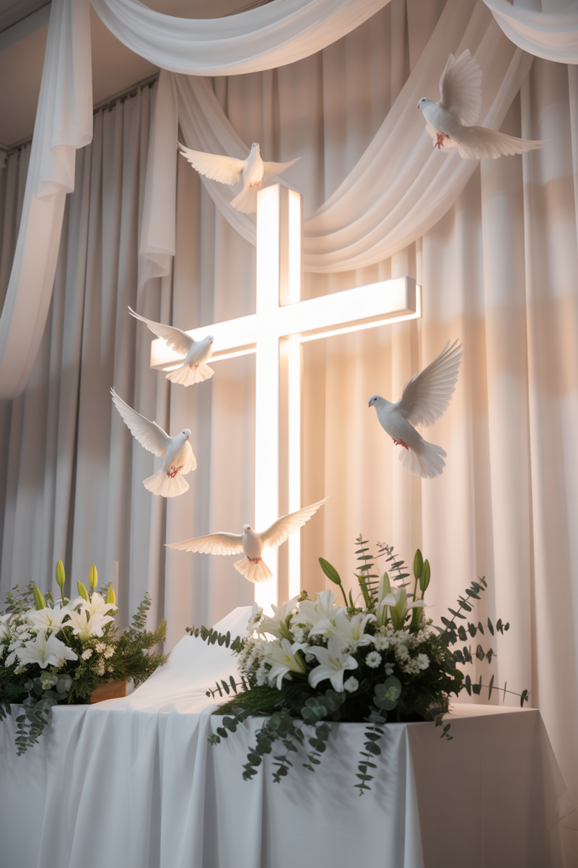 Use soft colors like white and pastel shades to keep the design clean and elegant. You can include subtle dove patterns or a cross backdrop to enhance the theme. This idea is simple but very meaningful and powerful.