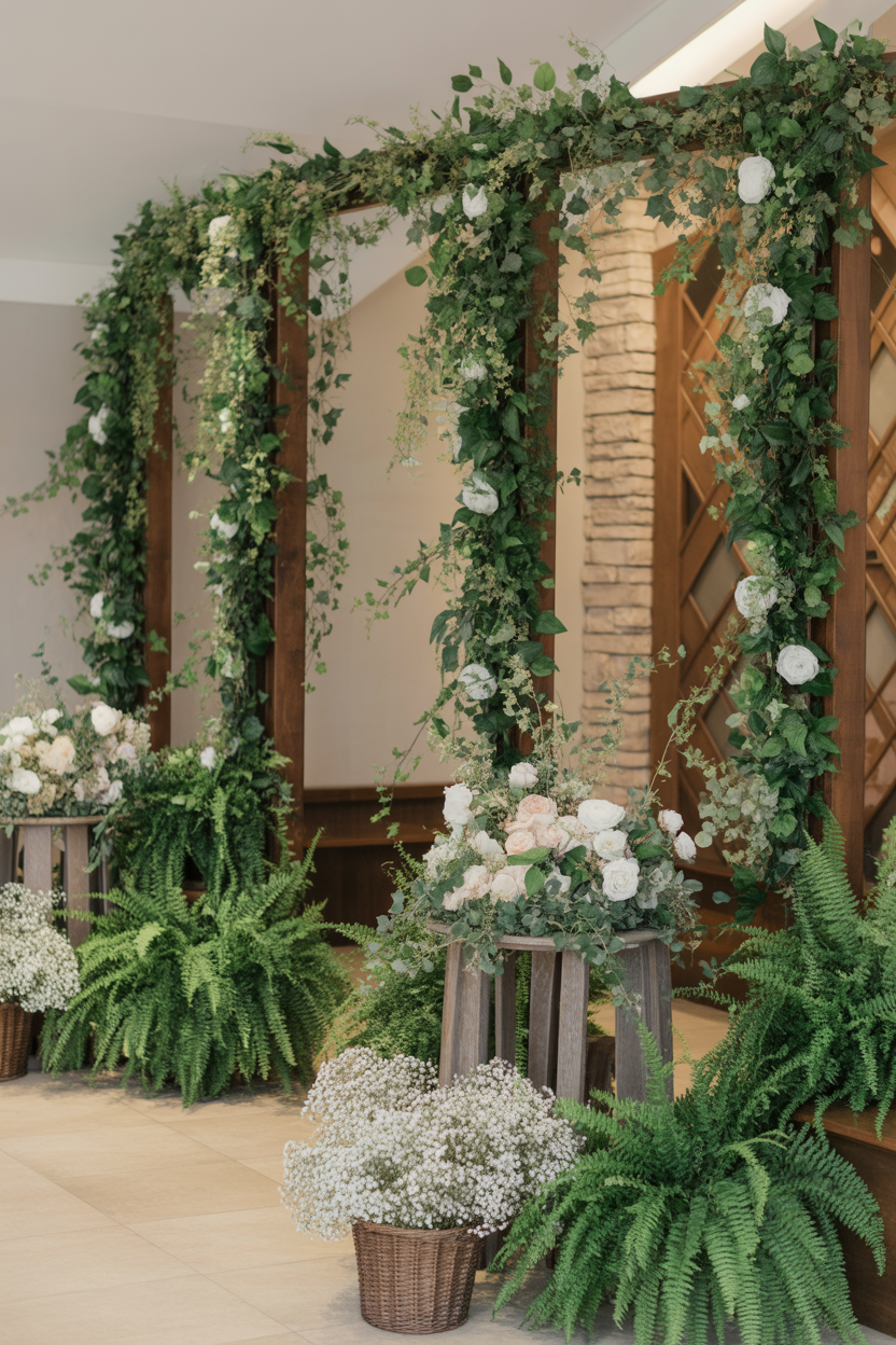 A nature-inspired setup always feels fresh and calming. You can use green leaves, vines, and flowers to create a small garden-like stage.