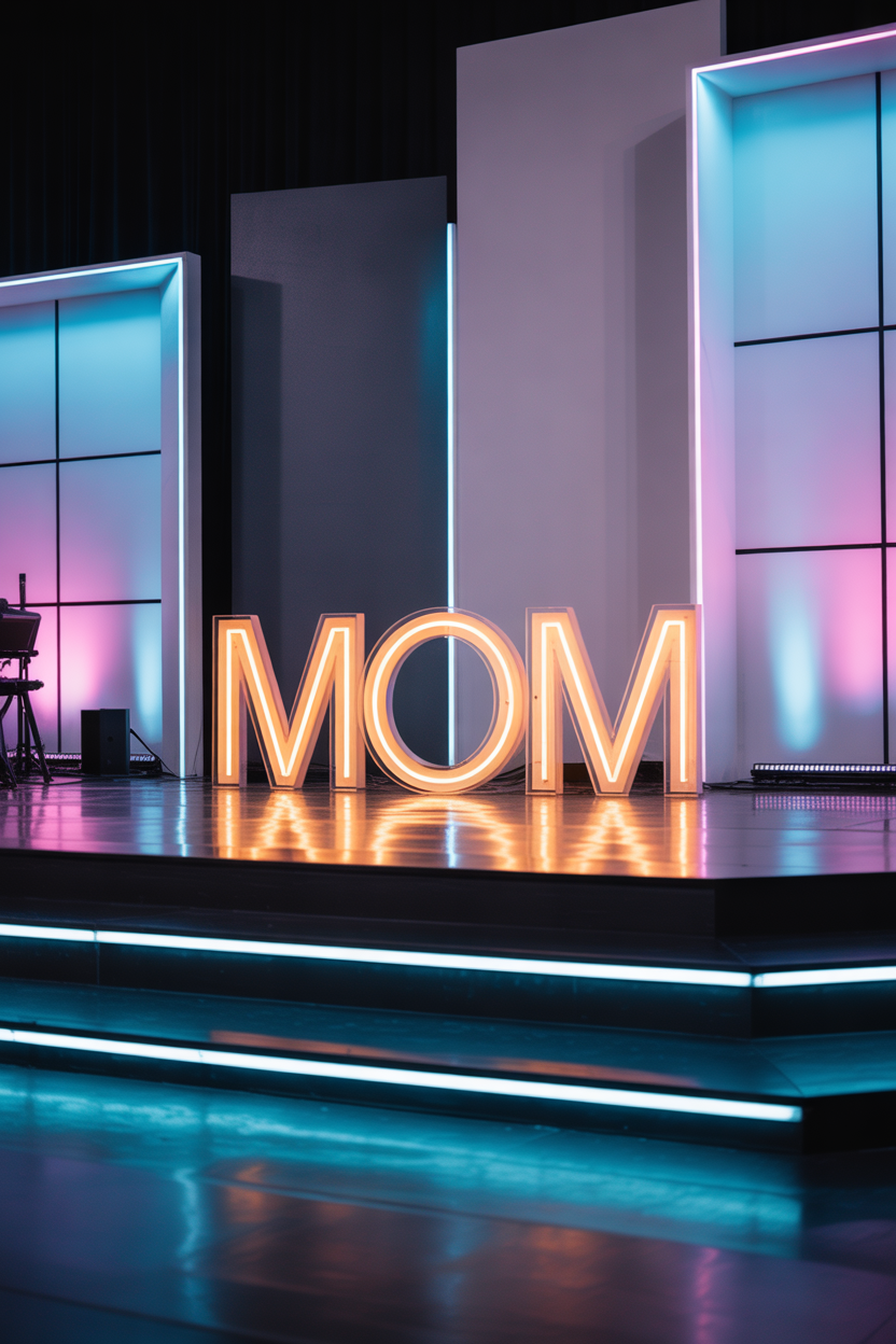 LED signs are modern and stylish decoration options. Words like “Mom” or “Love You Mom” in neon lights make the stage stand out instantly.