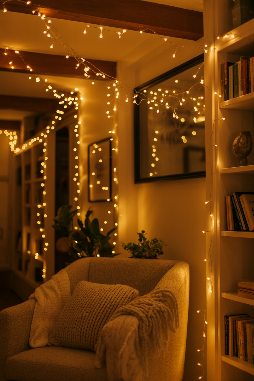 Fairy lights are one of the easiest ways to create a magical atmosphere at home. You can hang them on walls, windows, or furniture. They instantly make the space feel warm and beautiful.