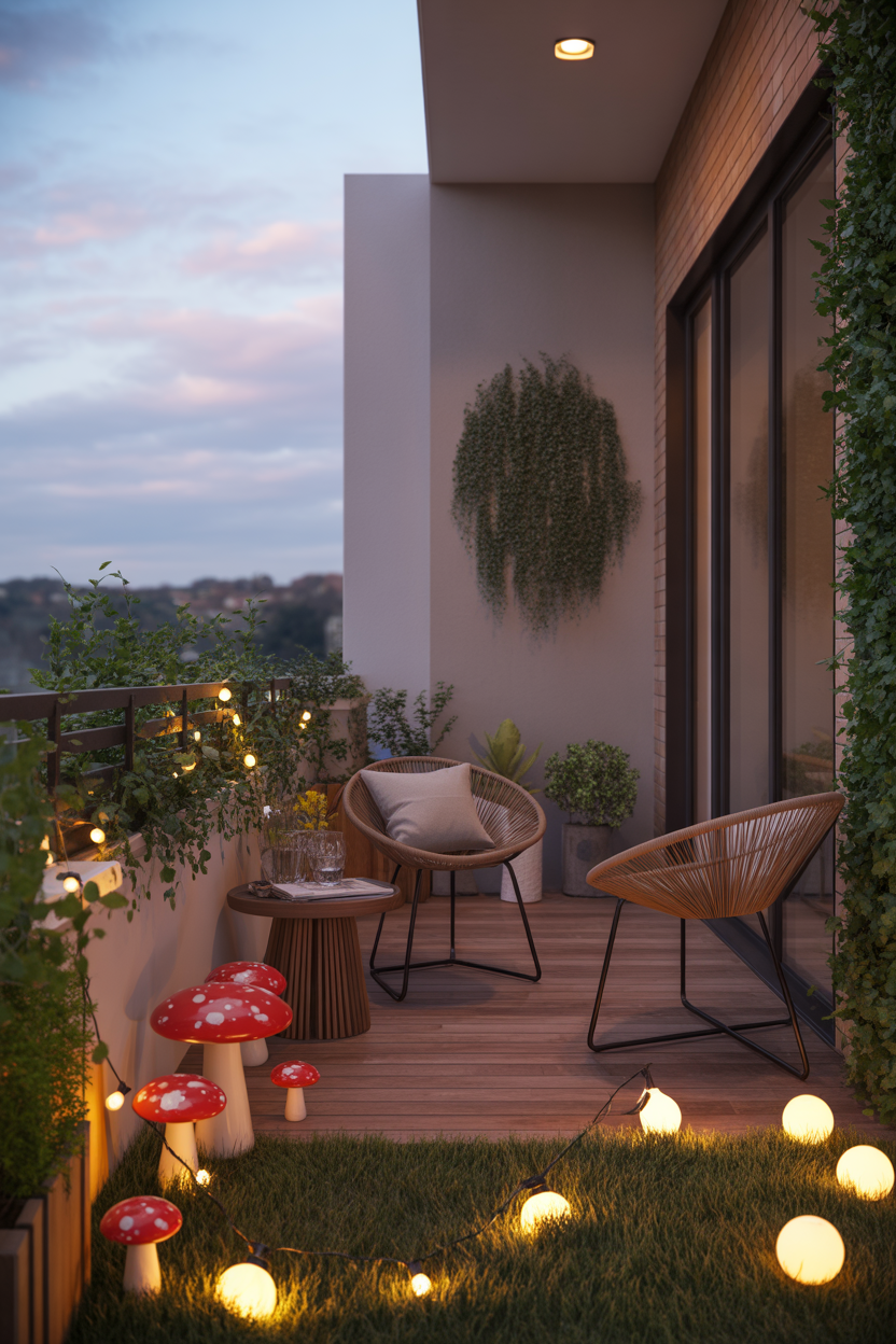 Even small balconies can have a mushroom garden theme. Use compact decor, vertical plants, and soft lighting to create charm in a limited space.