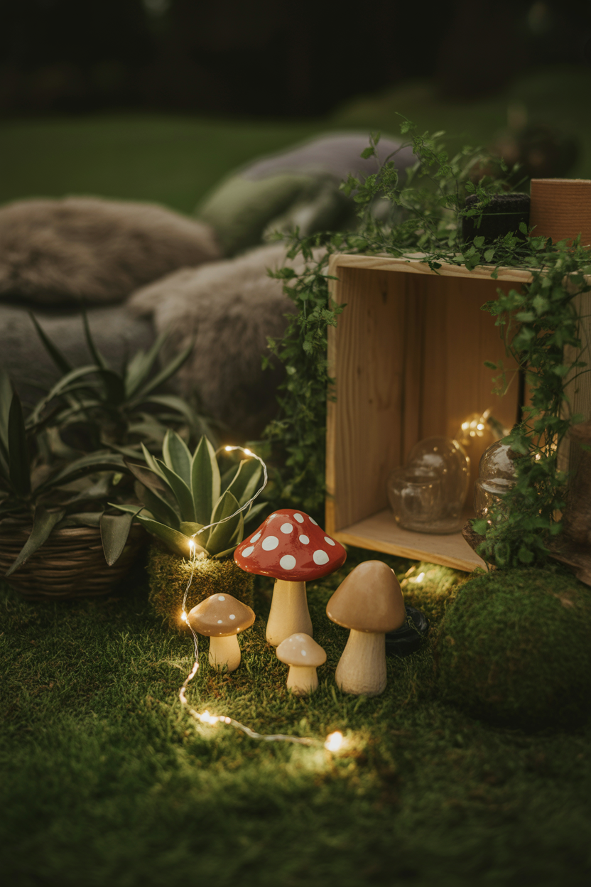 The mushroom garden aesthetic is all about soft lighting, earthy textures, and gentle storytelling through decor. It doesn’t need to look perfect — it just needs to feel natural and inviting.
