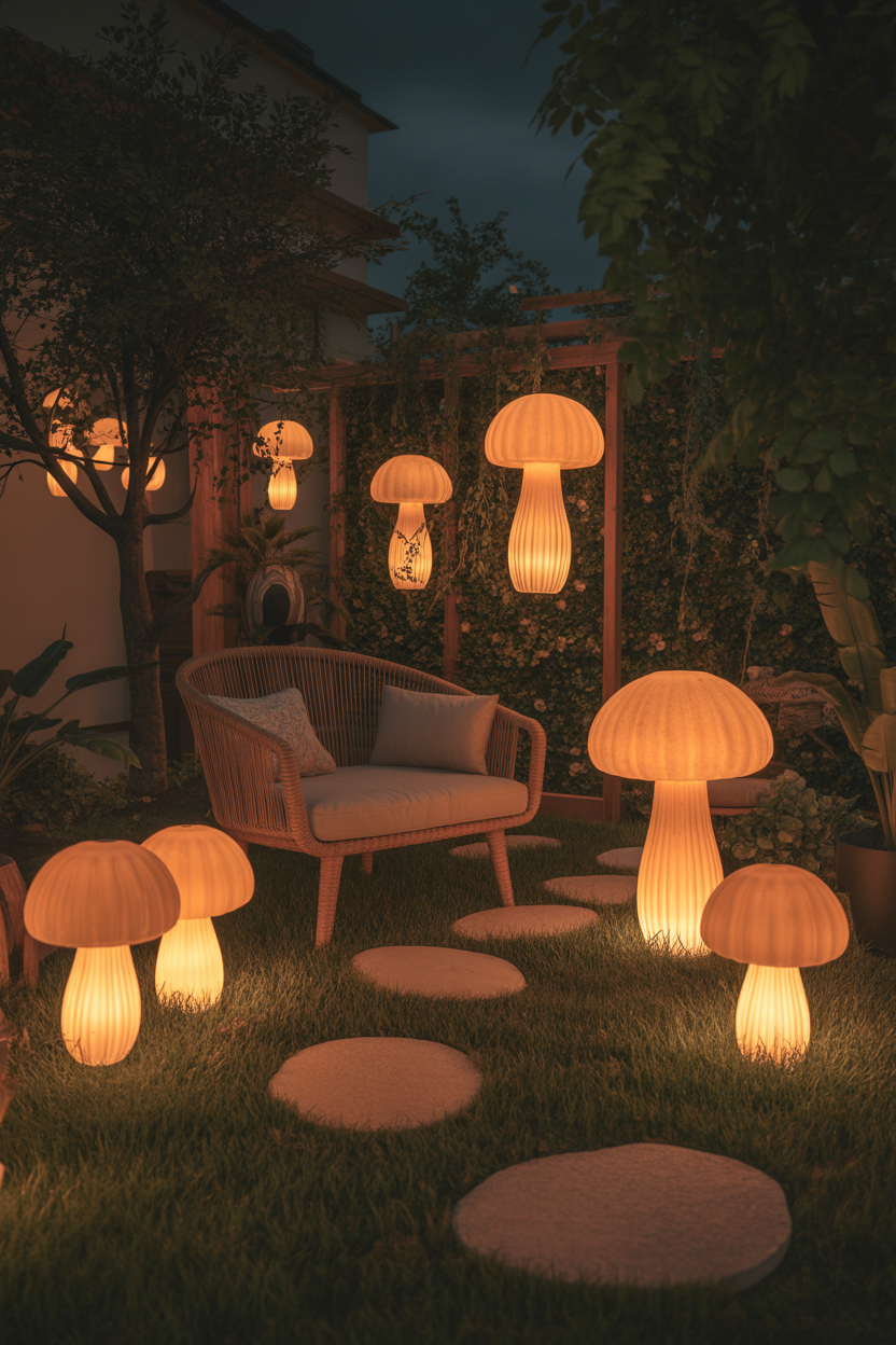 Hanging lanterns shaped like mushrooms creates a floating, magical effect in the garden. They look especially beautiful during evening hours.