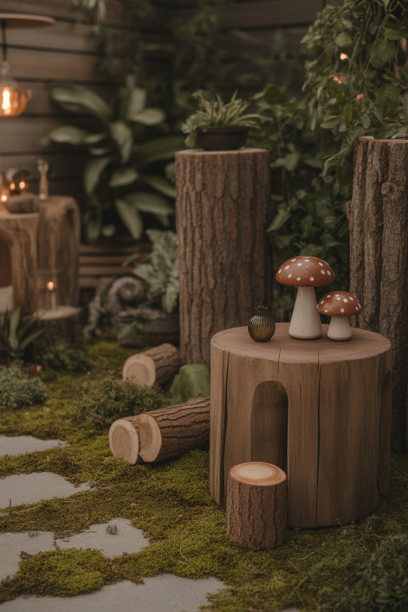 Wooden logs combined with mushroom decor create a raw, natural forest aesthetic. This setup feels grounded and organic, especially when placed near plants or shaded areas.