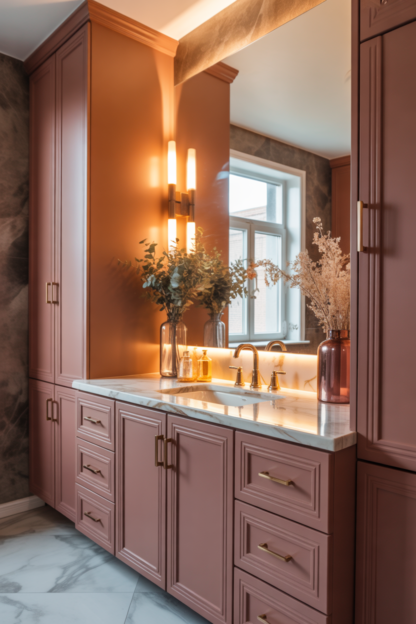 Dusty rose cabinets give bathrooms a mature and stylish personality. This tone feels warmer than bright pink and more elegant than pastel shades. It pairs beautifully with marble countertops and brass fixtures. Even a single vanity painted dusty rose can transform the room instantly. Under warm evening lighting, the color feels rich and inviting. This idea is trending strongly in 2026 interiors.