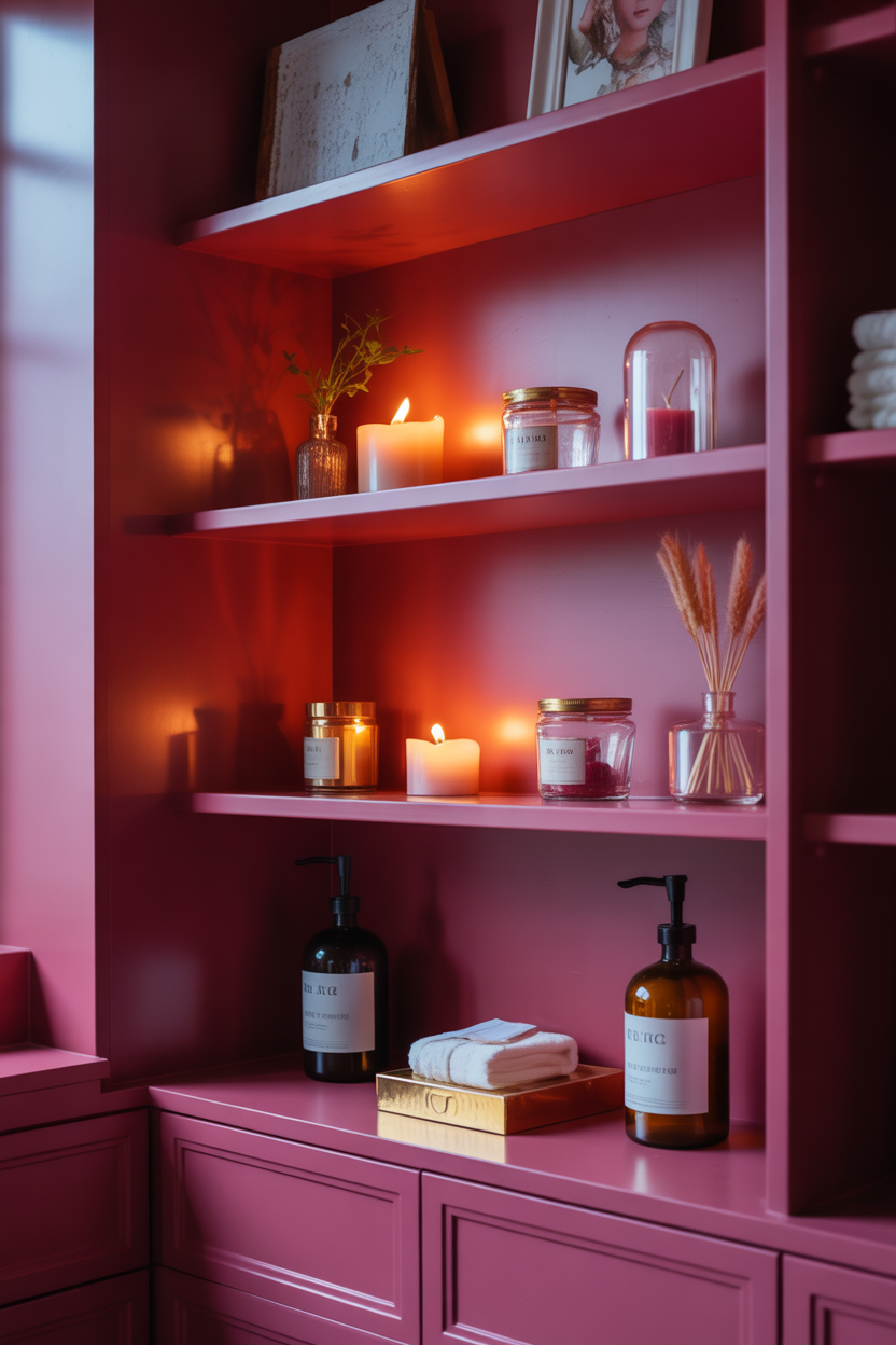 Open shelves allow easy styling with pink decor accents. They create both beauty and storage. Adding candles and jars enhances the cozy feeling. Evening lighting creates soft shadows around objects. This idea suits modern bathrooms perfectly. It keeps everything organized yet stylish.