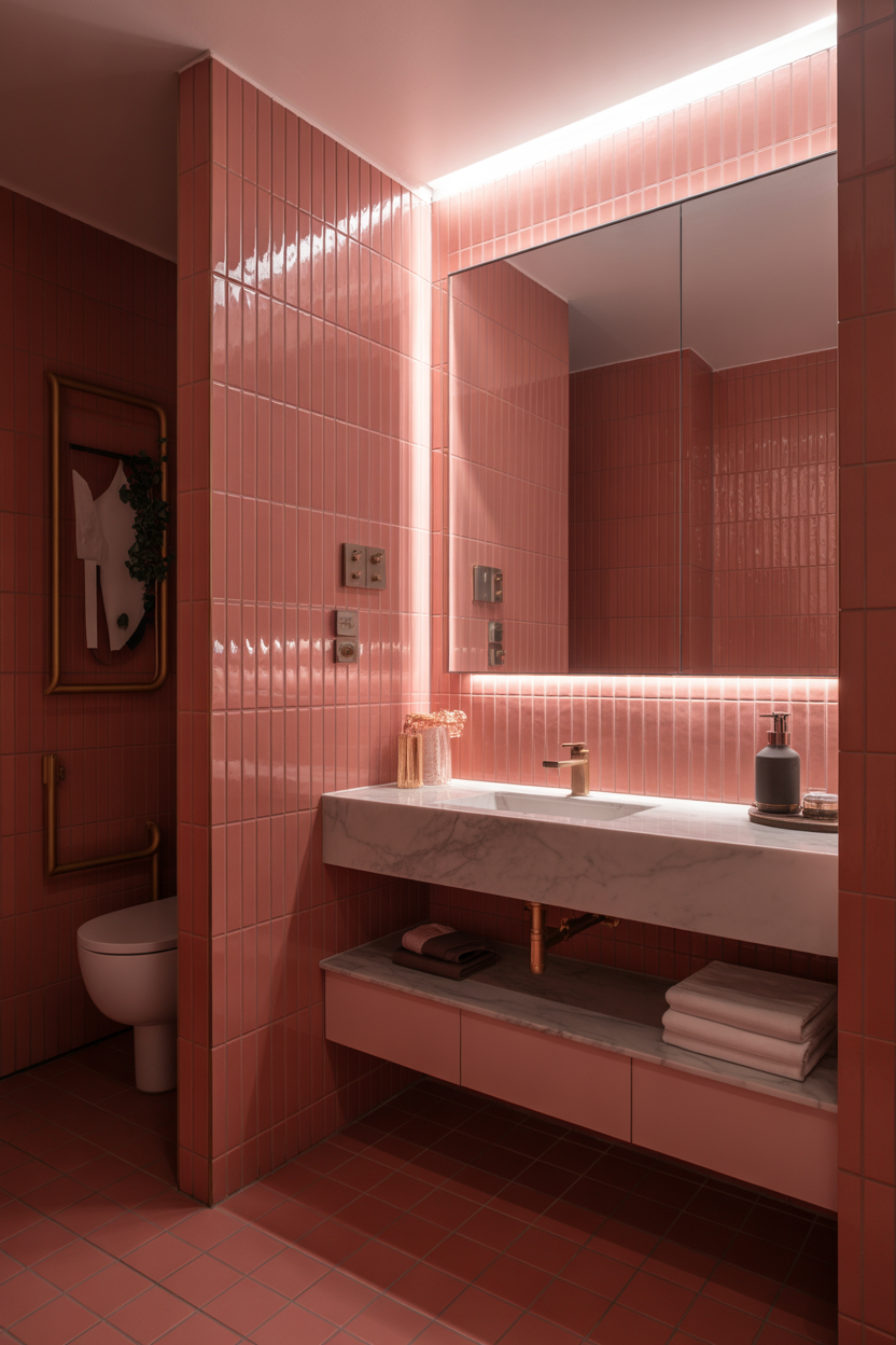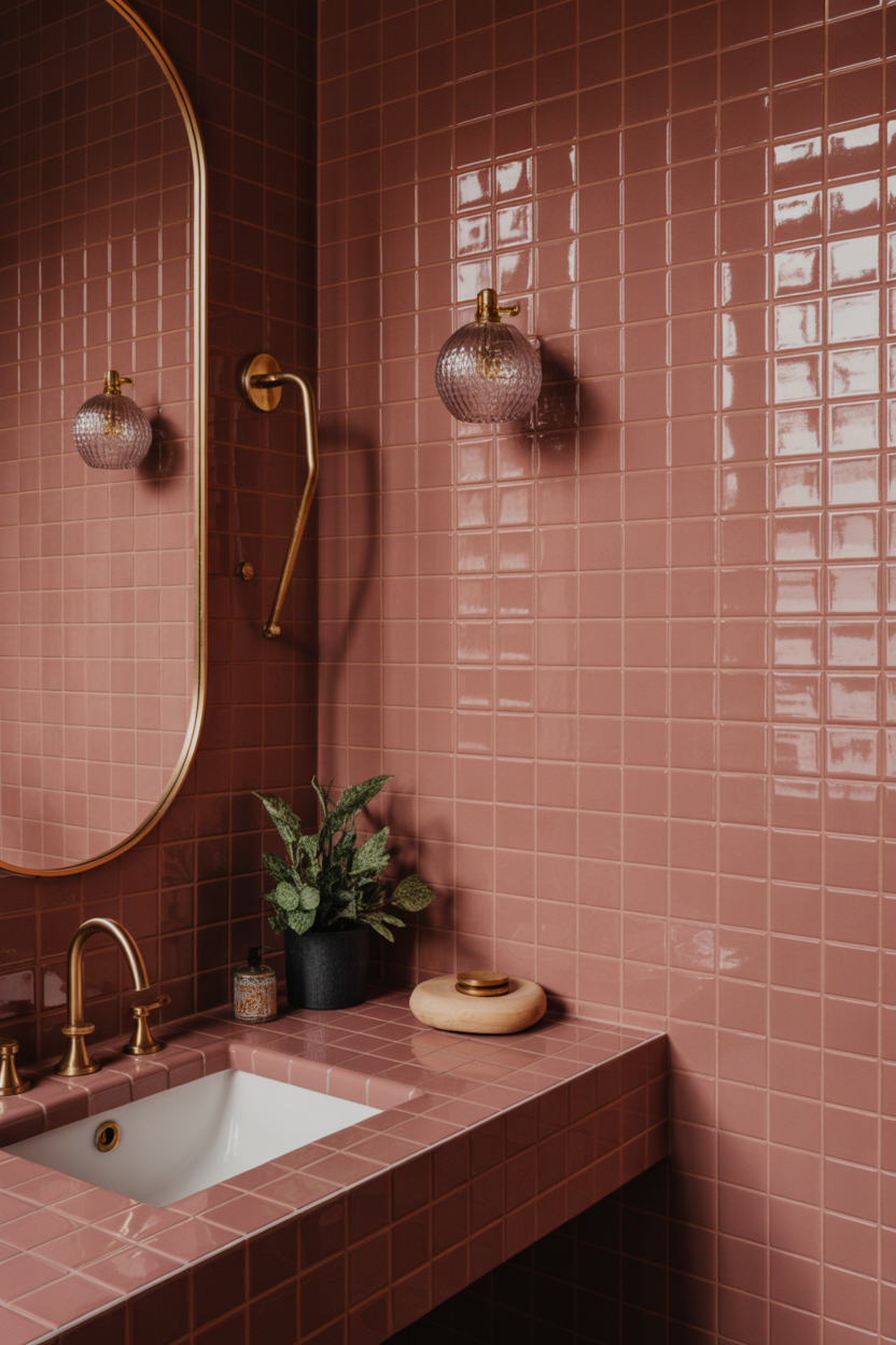 A pink tile accent wall creates a strong designer focal point in the bathroom. It draws attention to the vanity area and adds texture without overwhelming the space. Glossy tiles reflect light beautifully during evening hours. This idea works well for renters using peel-and-stick tiles, too. Choosing geometric or vertical layouts adds a modern personality. It instantly upgrades a simple bathroom.