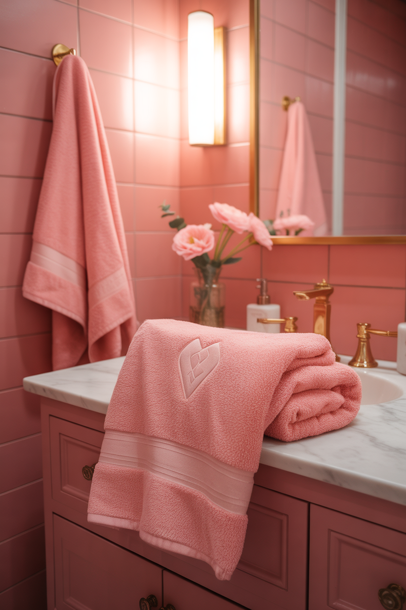 Simple towel styling can refresh a bathroom instantly. Pink towels add color without permanent changes. Layering shades creates depth and softness. Evening lighting enhances fabric texture beautifully. This is perfect for budget upgrades. It works in every bathroom size.