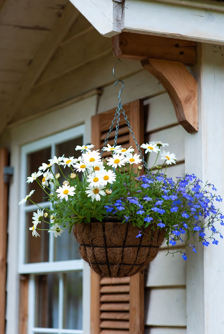 A cottage garden basket looks soft, romantic, and charming. Mixing daisies, lobelia, and ivy creates a natural and slightly wild garden feel.