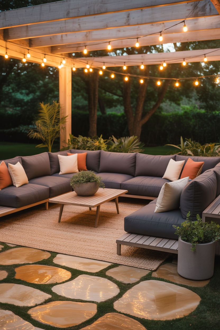 Turn your flagstone patio into a full outdoor living room where comfort meets style. This design brings indoor coziness outside by adding sofas, rugs, and soft textures. The natural stone base balances the softness of furniture, creating a perfect blend of comfort and durability.