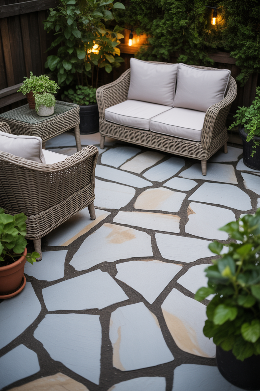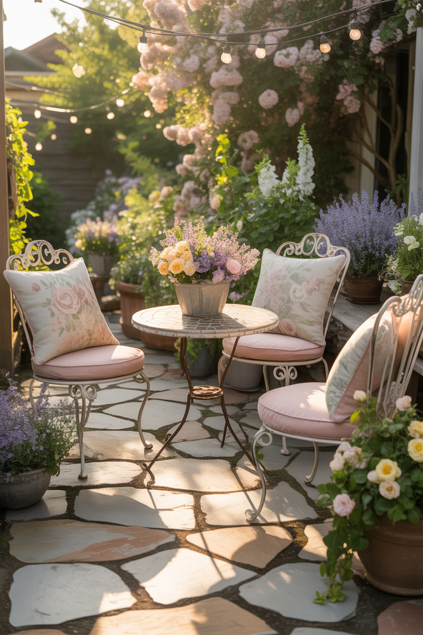 A cottage-style patio feels soft, charming, and full of personality. With flagstone as the base, you can add flowers, pastel colors, and vintage decor to create a dreamy outdoor space.