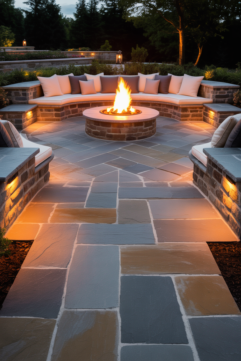 A cozy fire pit patio is one of the most loved outdoor setups—and for good reason. The natural flagstone creates a warm base that blends beautifully with a glowing fire feature. This design makes your backyard feel like a retreat where people gather, talk, and relax for hours. The mix of stone textures and soft lighting creates a peaceful, welcoming vibe.