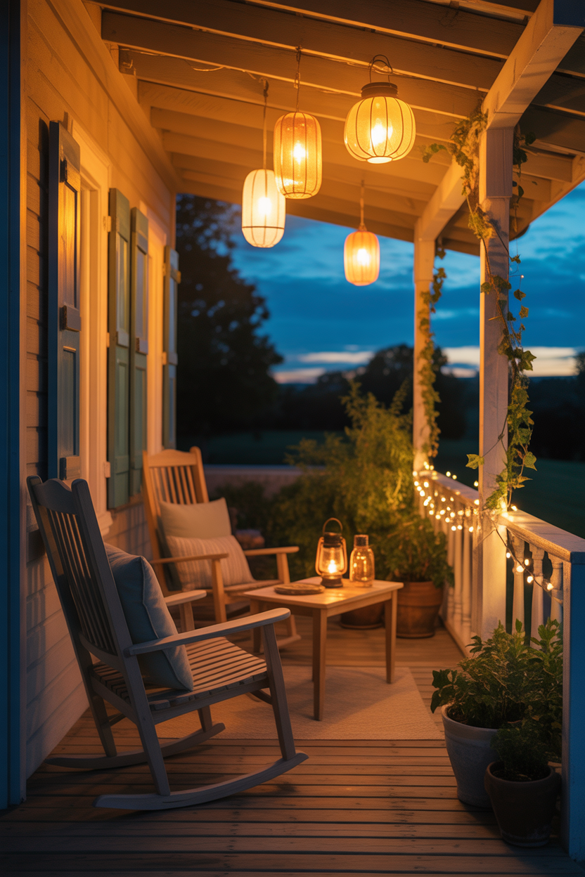 Lighting can completely change the mood of your porch, especially at night. Lanterns create a soft, warm glow that feels calm and relaxing. Whether you choose metal lanterns, glass ones, or wooden styles, they add charm and depth.