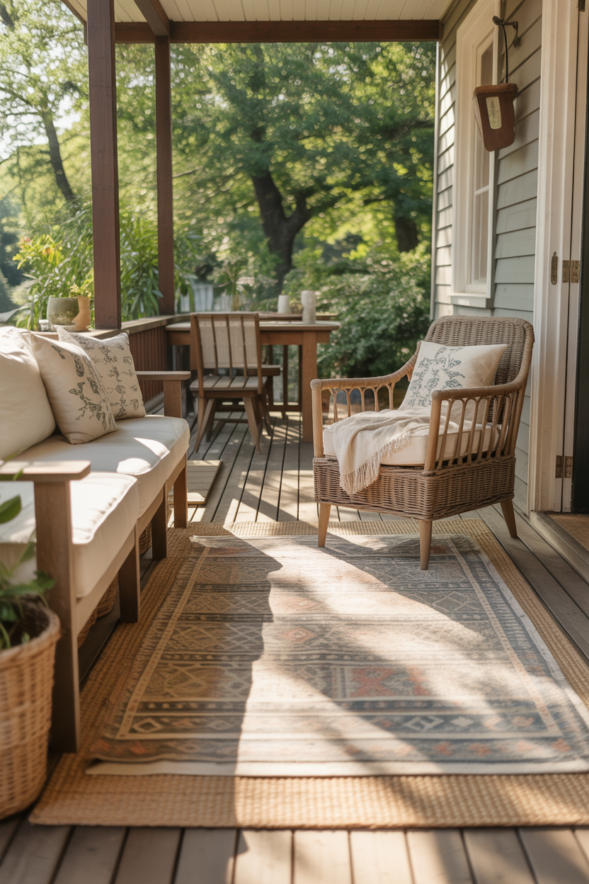 A layered rug setup instantly makes your porch feel warm, styled, and inviting. Instead of using just one rug, try placing a smaller patterned rug over a larger neutral one. This creates depth and gives your space a designer look without much effort. It also helps define your seating area and makes everything feel more put together.