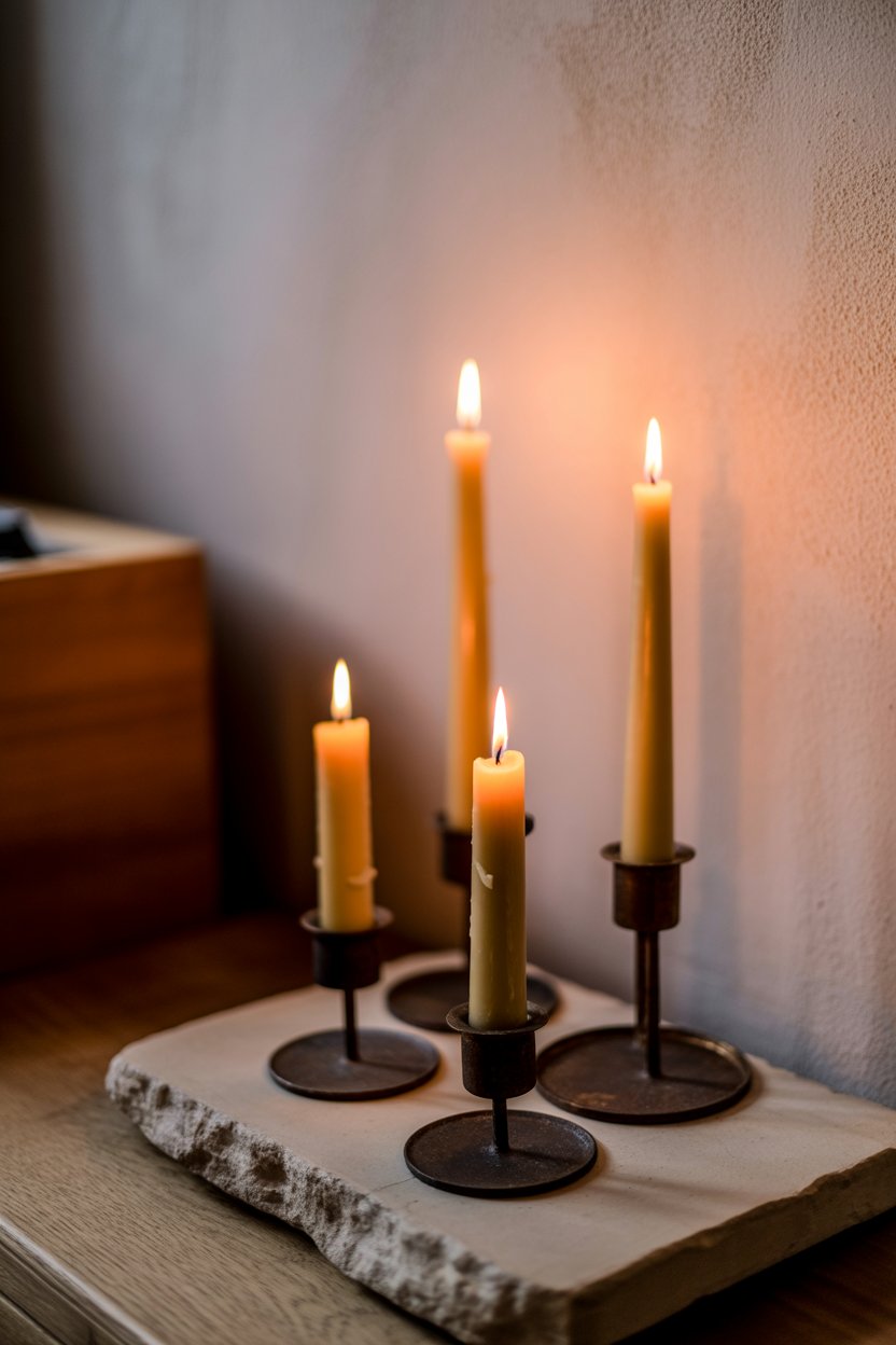 Beeswax candles in simple holders are the most natural choice — they burn cleanly and have a warm, subtle honey scent that adds another sensory layer to the room. Group them in odd numbers at varying heights for the most natural-looking arrangement. Simple iron or clay candlestick holders work better here than anything ornate or decorative. And honestly, even one candle burning on an otherwise empty coffee table can shift the entire mood of a room in seconds.