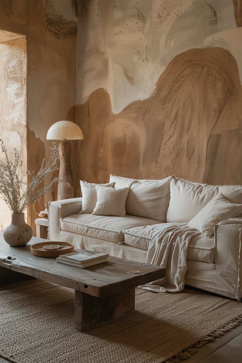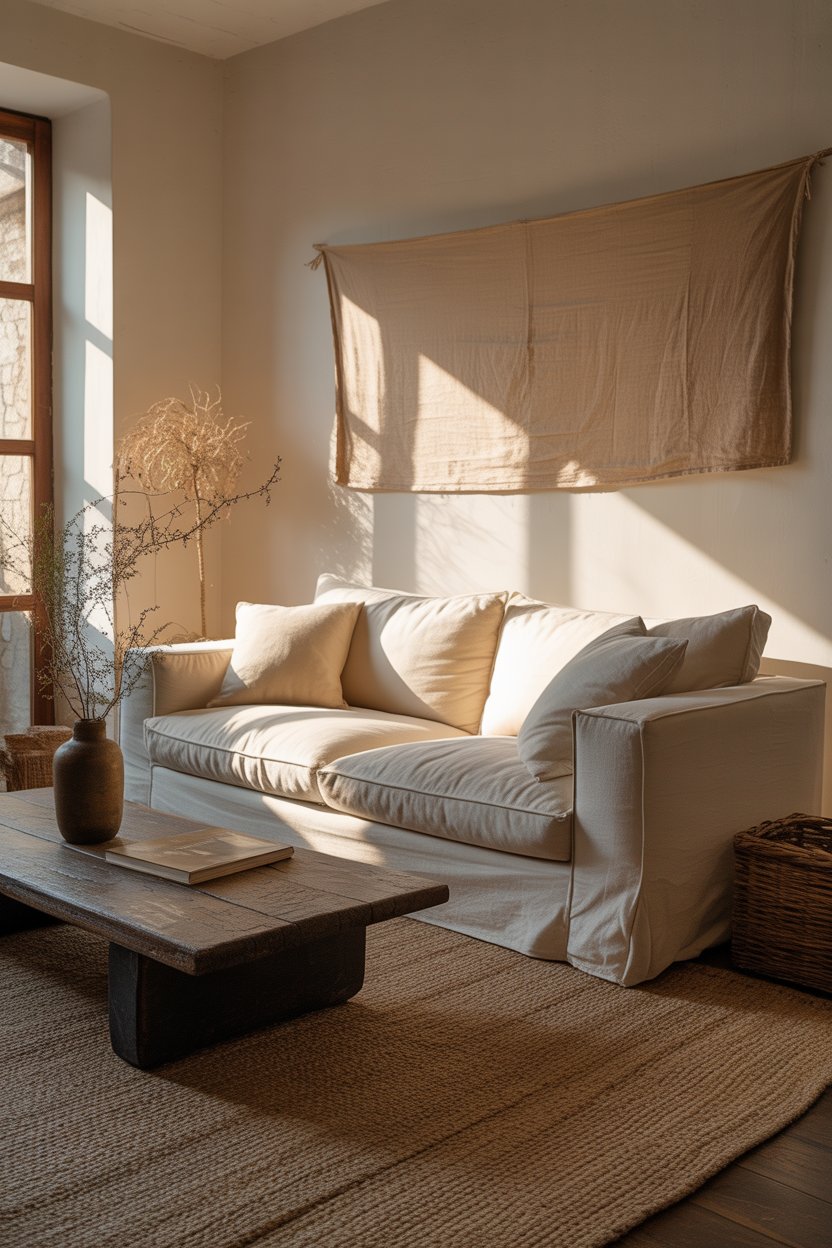 The sofa is the heart of any living room, and in a wabi sabi space, it has one job: to look genuinely comfortable and completely unpretentious. Natural linen slipcovers are the ideal choice — and here’s the thing that surprises most people: the wrinkles are a feature. A slightly crumpled linen sofa looks lived-in and real in a way that a tightly upholstered, perfect sofa never can. It looks like someone actually sits on it, reads on it, and falls asleep on it.