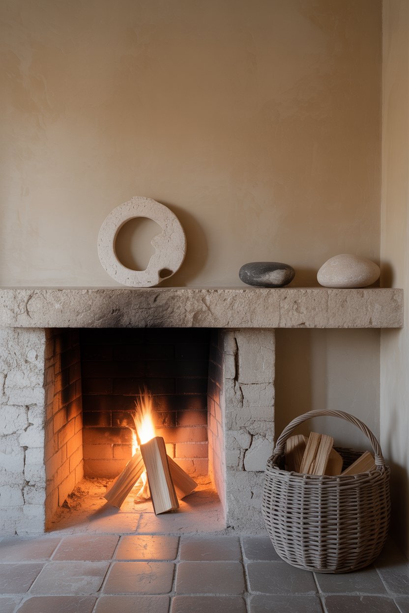 A raw stone surround is the most authentic choice — irregular stone, visible mortar, completely unpolished and beautiful for it. A limewash plaster fireplace wall creates a softer version of the same idea. On the mantle, keep it extremely simple: one handmade ceramic piece, a small smooth stone, a single candle. That’s genuinely enough. The hearth area can hold a woven basket for firewood, a simple iron tool set, and maybe one trailing plant — nothing more.
