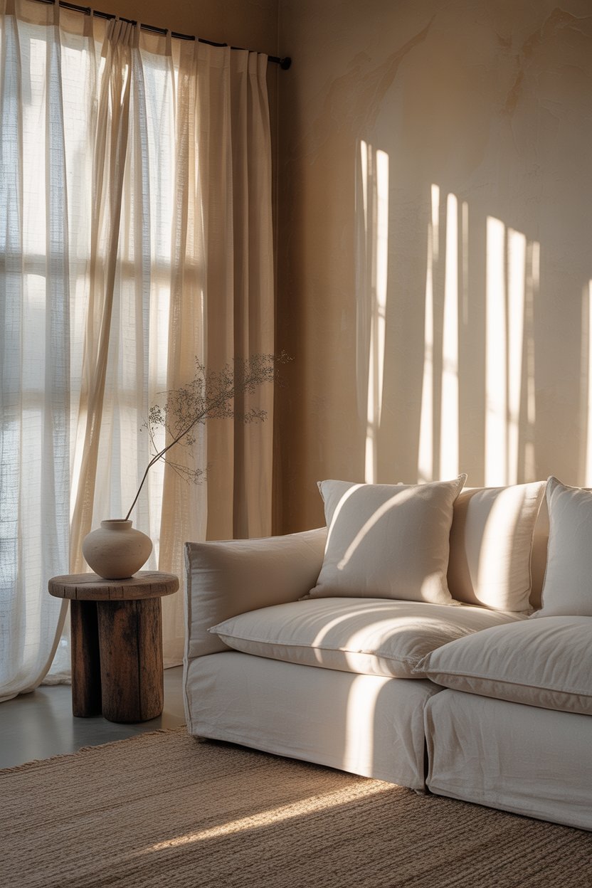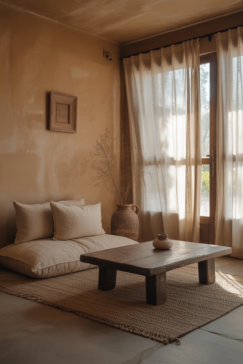 The goal is to let light behave naturally rather than controlling it too tightly. Sheer linen or cotton curtains filter light into something soft and warm without blocking it. If privacy isn’t an issue, bare windows work beautifully in this aesthetic — the raw, unadorned look is very much in keeping with the philosophy. Position your main seating area where the best natural light falls, and let the room organize itself around that.