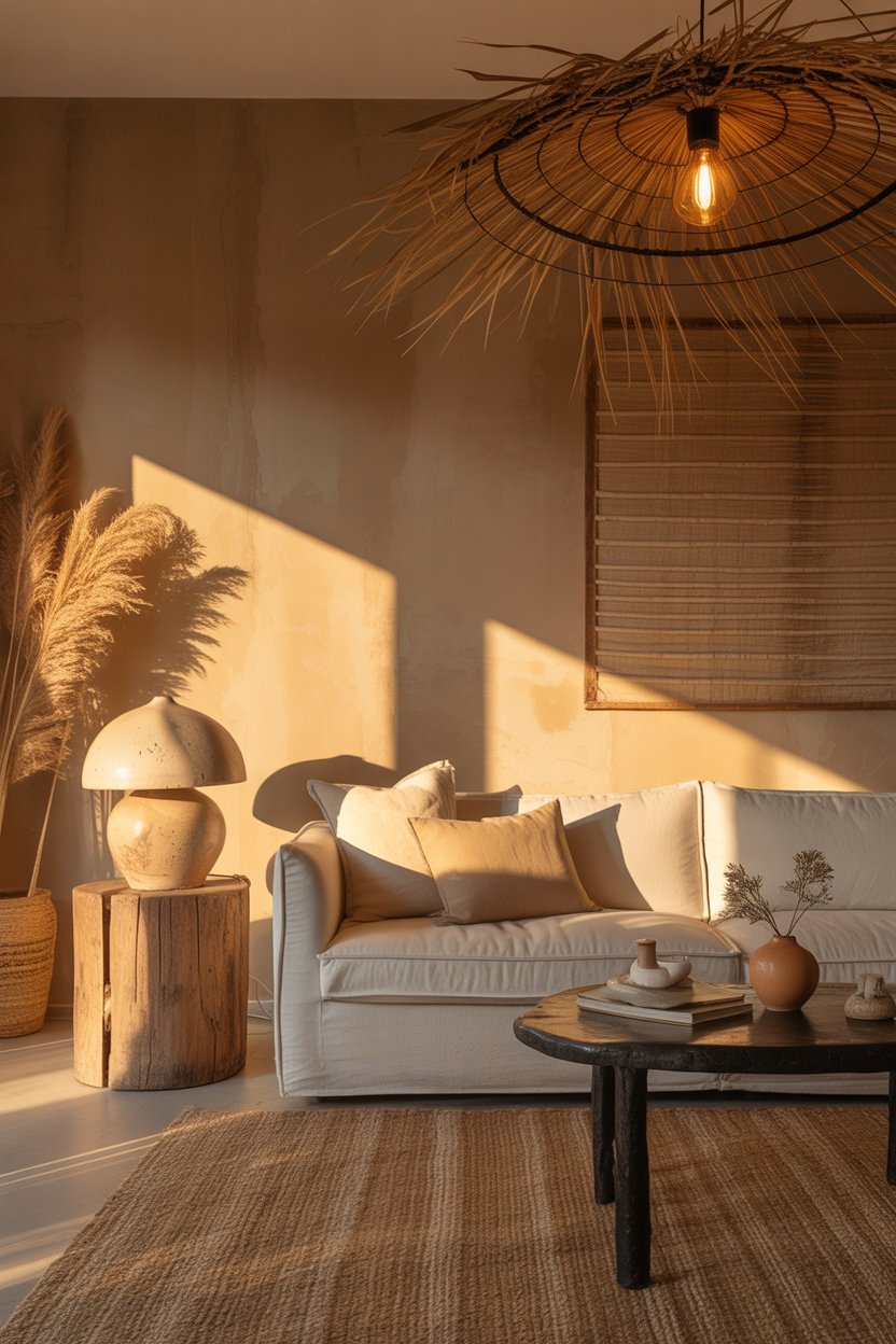 Harsh overhead lighting is probably the single fastest way to destroy the atmosphere of a wabi sabi living room. A bright ceiling fixture floods everything evenly, eliminating the shadows and warm pools of light that give this aesthetic its depth and soul. The goal is always soft, diffused, layered light from multiple sources at different heights — never one harsh source from above.