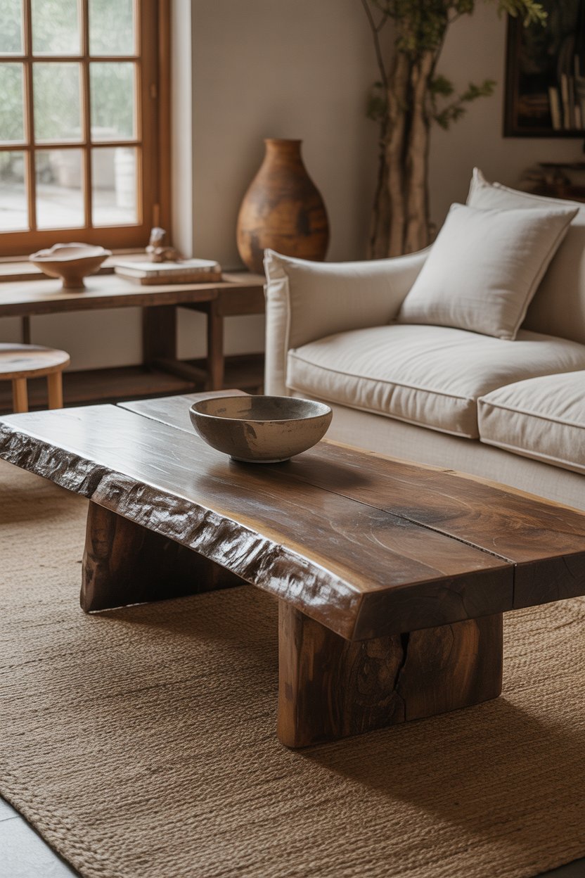 For living rooms, the best reclaimed wood pieces are coffee tables, low benches, side tables, and open shelving. A live-edge coffee table — where one or both sides follow the natural edge of the original tree — is one of the most stunning wabi sabi furniture choices you can make. It’s completely one-of-a-kind, visually interesting, and deeply connected to the natural world in a way that a perfect, factory-finished table simply isn’t.